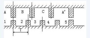 電機轉子均勻分布著很多小齒,定子齒有三個勵磁繞阻,其幾何軸線依次分別與轉子齒軸線錯開。0、1/3て、2/3て,(相鄰兩轉子齒軸線間的距離為齒距以て表示),即A與齒1相對齊,B與齒2向右錯開1/3て,C與齒3向右錯開2/3て,A'與齒5相對齊,(A'就是A,齒5就是齒1)下面是定轉子的展開圖: